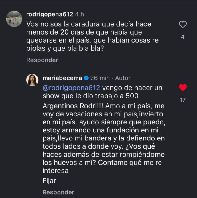 La respuesta más fuerte llegó cuando Becerra puso sobre la mesa hechos concretos: recordó que viene de realizar un show que generó trabajo para más de 500 argentinos, que invierte en el país, vacaciona en Argentina, colabora cuando puede y que incluso se encuentra armando una fundación. Además, remarcó que lleva la bandera argentina a cada lugar al que va y que no necesita dar lecciones de patriotismo desde una red social.